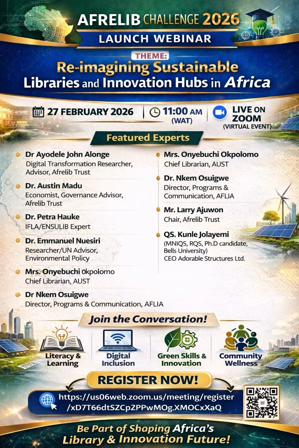 Join the AfreLib Challenge 2026 Launch Webinar — a pan-African initiative to generate practical solutions for sustainable, inclusive, and resilient libraries and innovation hubs.